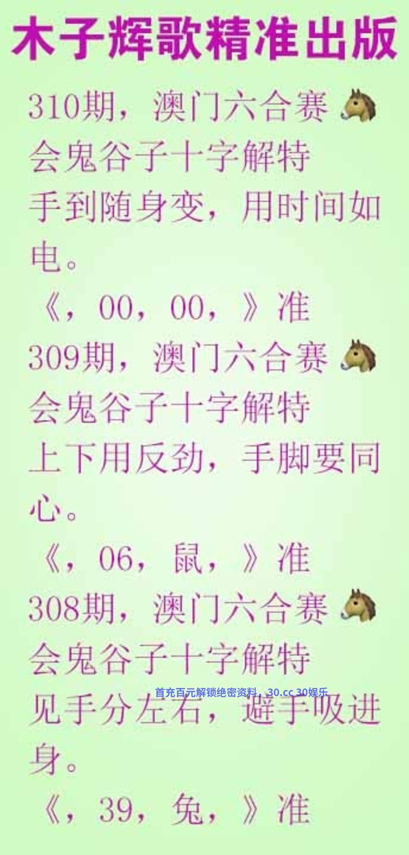 305期七尾▓1234578▓开:鼠42中 306期七尾▓0235679▓开:牛17中 307期七尾▓0234589▓开:狗20中 308期七尾▓0346789▓开:兔39中 309期七尾▓1245678▓开:鼠06中 310期七尾▓0123467▓开:虎16中 311期七尾▓2346789▓开:蛇37中 312期七尾▓0134578▓开:龙14中 313期七尾▓2456789▓开:龙38中 314期七尾▓0123578▓开:羊23中 315期七尾▓0124567▓开:發00中 澳门木子辉歌【澳门跑马图】9715888.com 314期 313期 312期 311期 310期